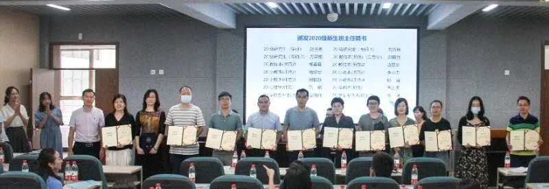 彭小媚副书记宣读2020年度学院本专科、研究生班主任聘任文件,张敏部长与何毅书记为20级新生班主任颁发聘书。