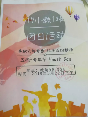 5月18日下午,17学前本举办了以“五四精神与我”为主题的团日活动。为了让班级同学更加了解历史的发展,班委播放了电影《我的1919》,使得同学对五四运动有了更深刻的印象。随后在团支书的带领下,班级同学重温了入团誓词,以此增强团员意识,清楚团员的使命和义务。最后借这次机会,同学们都在明信片上写下了对祖国,对青年的祝福,愿将来可以以自己的力量来献礼祖国。