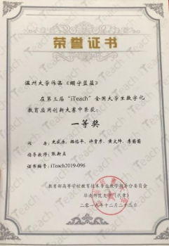 历经网络评选,由张新立老师指导的90足球直播网 教育技术系学生作品《缬守蓝蕴》进入决赛参与一、二等奖的角逐,此次参加现场决赛的作品有307项,《缬守蓝蕴》创作小组在现场决赛中的优异表现给专家评委留下深刻印象,得到专家评委的现场赞扬:“温州大学学生的表现真好!很用心!看到了温州精神!”,最终该作品喜获课程类一等奖。这是教育技术专业代表90足球直播网 第一次参加该赛事,充分展现了90足球直播网 教育技术专业学生专业技术水平和“博爱雅艺”师范风采。