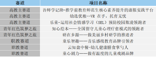 有秉持“知心童行”理念,永怀童心,知心相随,致力于领跑全国留守儿童心理疗愈模式的“知心绘本”。有以弘扬并传承中华传统戏剧文化为初心,做有温度的儿童戏剧品牌的“童心剧力”。有立志做幼儿健康膳食的掌勺人的“云知盘中餐”,还有以助推学前教育师范生核心素养提升为理念,欲创建虚拟实践平台的“吾师•学记”,“童乐智趣”——音乐感教统教育品牌的引领者等等优秀项目。