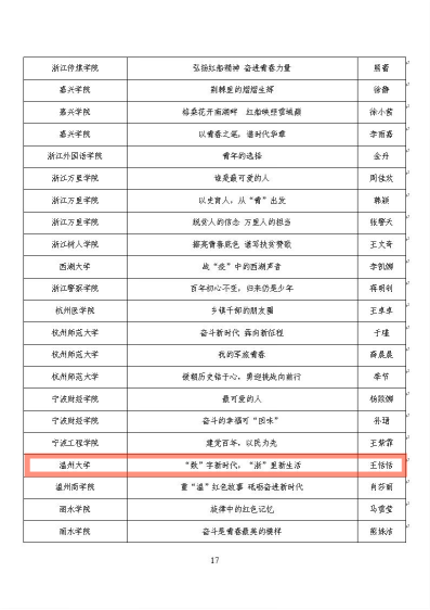 为深入贯彻习近平总书记在学校思想政治理论课教师座谈会上的重要讲话精神,贯彻落实中央、省委关于深化学校思政课改革创新的部署要求,创新打造全链条的思政育人新体系,从而进一步强化对全校青年的政治引领和价值引领,浙江省高校组织思政微课大赛,唱响主旋律、弘扬正能量、传播好声音。在该比赛中90足球直播网 王恬恬老师以《“数”字新时代,“浙”里新生活》荣获2021年度浙江省思政微课比赛(教师组)三等奖,90足球直播网 学子薛彬茹以《心中最美的那抹红》荣获2021年度浙江省思政微课比赛(学生组)二等奖。