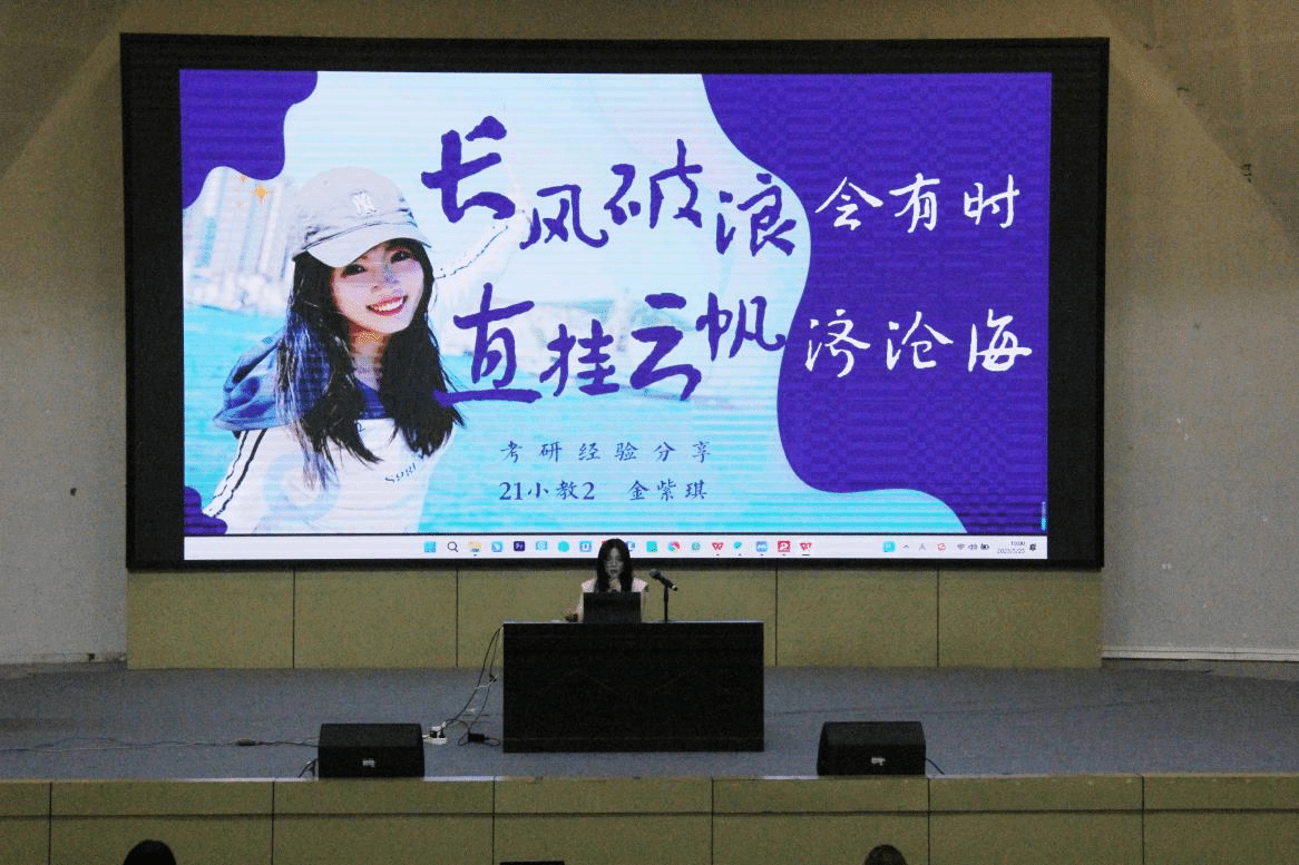 方向珍学姐升入本校学前专业继续学习,她以自己的考研故事作为导入,介绍了考研的重要时间段,择校原因总结了各学科学习都要专一、背诵、运用知识点、模考、复盘。最后学姐也提醒考研时要保持良好的心态,积极面对难题。