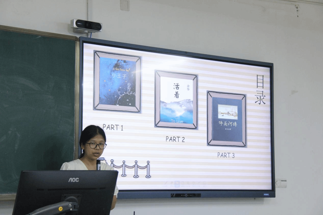 23小教2班同学以“逐梦之旅与心灵的绽放”为题,分享同学们对《茶花女》《骆驼祥子》《杀死一只知更鸟》等书籍剖析与理解,同时,还利用ai制作了一段视频,以阅读书籍传达成长祝福。