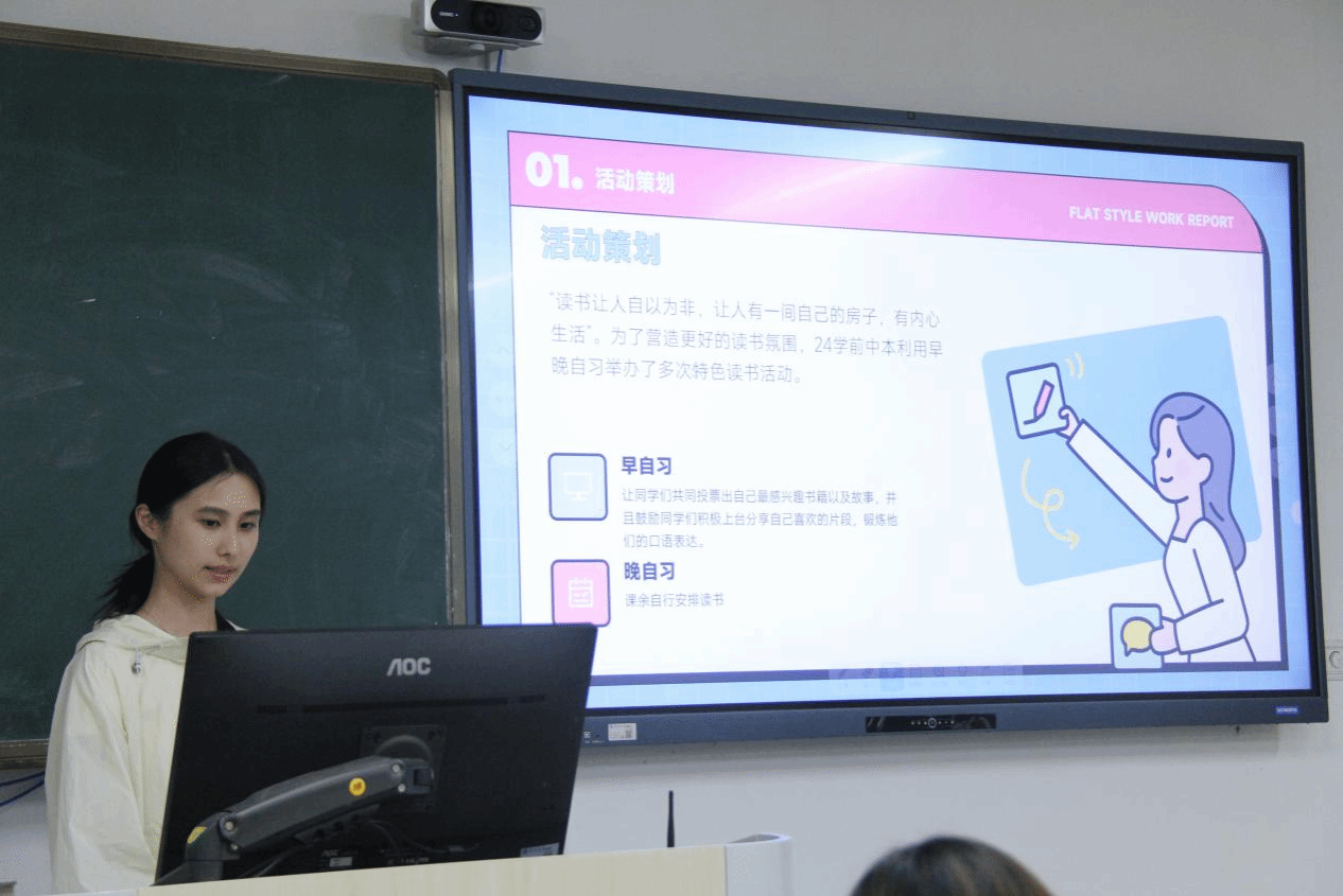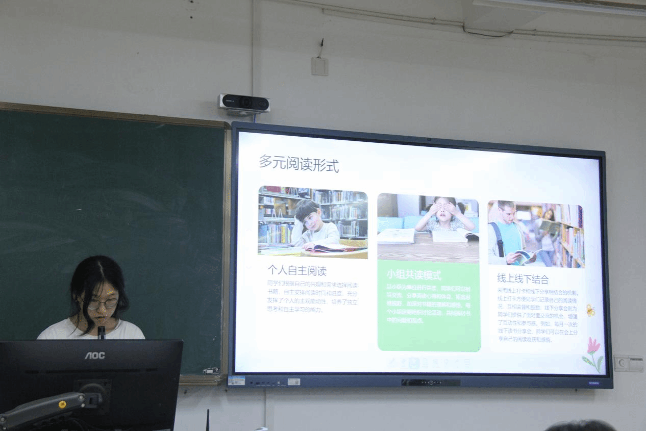 24小教4班同学们介绍了班级阅读活动概况,展现了班级多元的阅读形式,通过这些阅读形式同学们既能沉浸在自己的阅读世界里,也能和同学一起讨论,碰撞出思想的火花。同时他们也提出了在组织活动中的不足之处,应当增加阅读的专业性和丰富性。