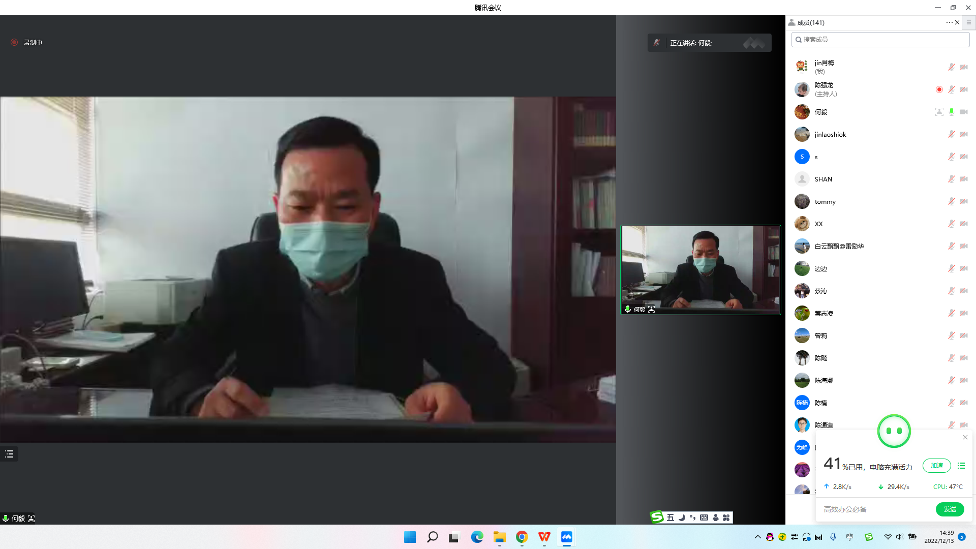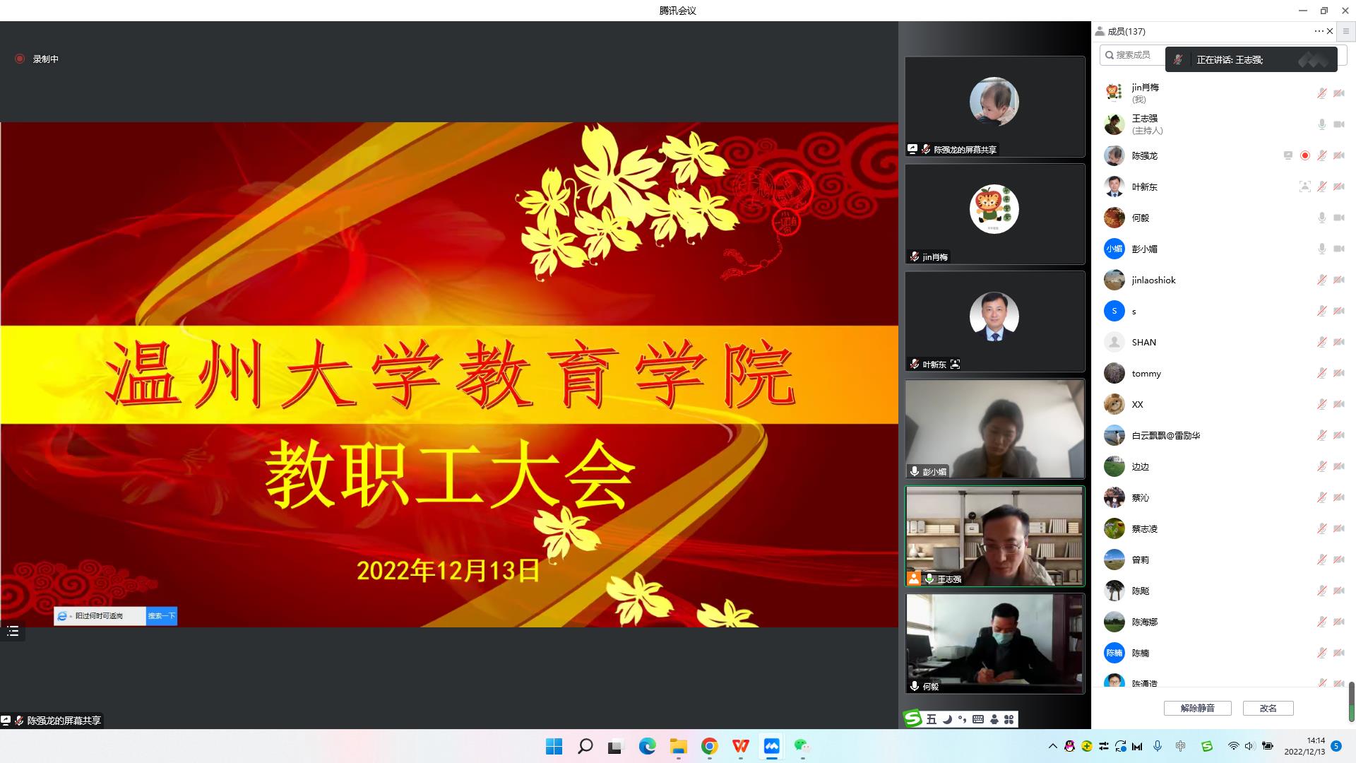何毅书记回顾了本学年的工作概况,全面传达了学校近期关于疫情防控工作的会议精神,并做总结讲话。何毅书记首先对当前学校疫情防控的严峻性做进一步分析,号召全体教职员工深刻领会学校会议精神提出的四点要求,高度认识疫情防控的紧迫性,做好自身健康的第一责任人,全力配合学校学院做好当前有关工作,共同筑牢温大防疫之堤。会议最后,何毅书记从期末教学秩序稳定、学生安全稳定工作、学期末工作总结梳理及新学期工作谋划、寒假科研项目申报及新春慰问等方面对学院当下工作进行部署。