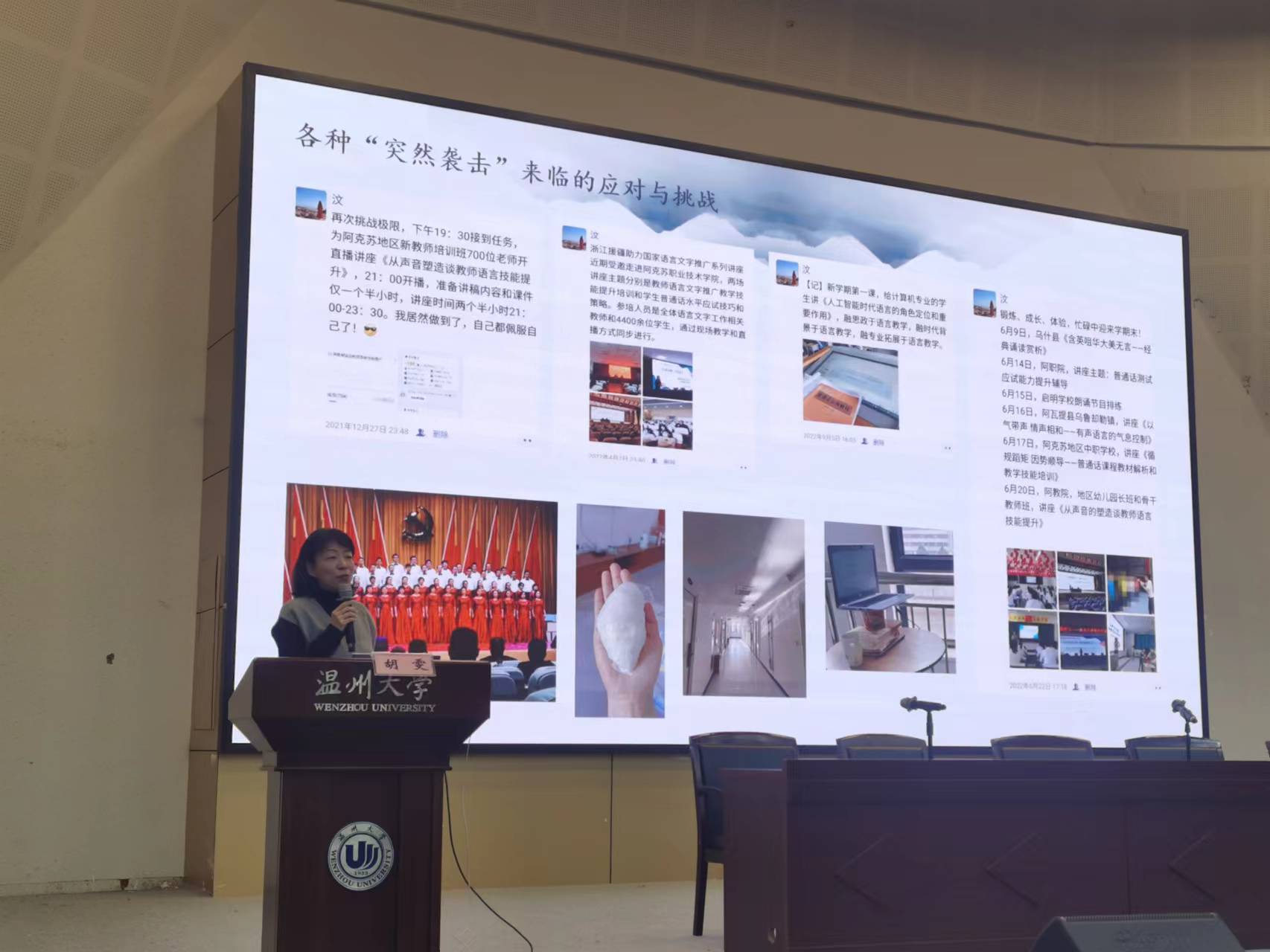 胡雯老师以《“语润疆土”西行杂谈》为题,深情地回顾了自己在阿克苏90直播 的支教经历。为圆青年时许下的梦想,胡雯老师欣然开启了她西行之旅。因为语言文字方面的特长,胡雯老师除了顶岗教学工作任务,还承担起了阿教院国家语言文字推广基地的主要工作。她起草《普通话教程》的课程标准和教学大纲,帮助阿克苏90直播 普通话实训课程提质增效;起草阿教院国推基地的当年规划和五年规划,通过教育部的审核,引导国推基地运行走上规范化运行的轨道;采用线上线下相结合的方式,为阿克苏地区学前、中小学、高校高职教师开展11个主题25个讲座,推广普通话,弘扬中华传统文化;发挥“组团式”援疆的工作优势,组建“语润浙疆”团队,领衔开展送经典下基层活动,让“经典润乡土”走进阿克苏各县市区,为地市乡镇学校带去经典示范展示和互动文化体验。胡雯老师还组织并策划阿教院首届教师朗诵大赛,锻炼教师教学基本技能;开放课堂,发挥教学上的引领示范作用;师徒结对,指导刚踏上讲台一年的徒弟获得教学一等奖,指导另一个徒弟首次获得教科研课题立项;选拔指导师生朗诵节目,获阿克苏地区“喜迎党的二十大朗诵比赛”一等奖……