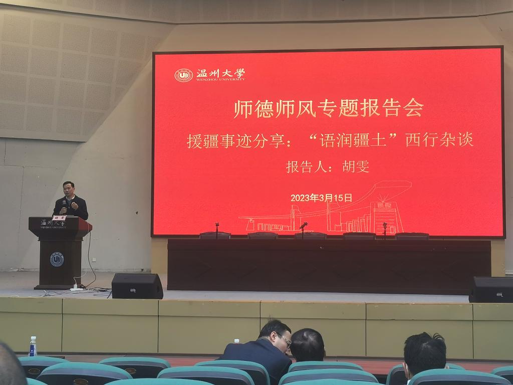 3月15日下午,90直播 举行师德师风专题教育活动,2022年底援疆归来的胡雯老师作援疆事迹专题报告。活动由学院党委书记何毅主持。