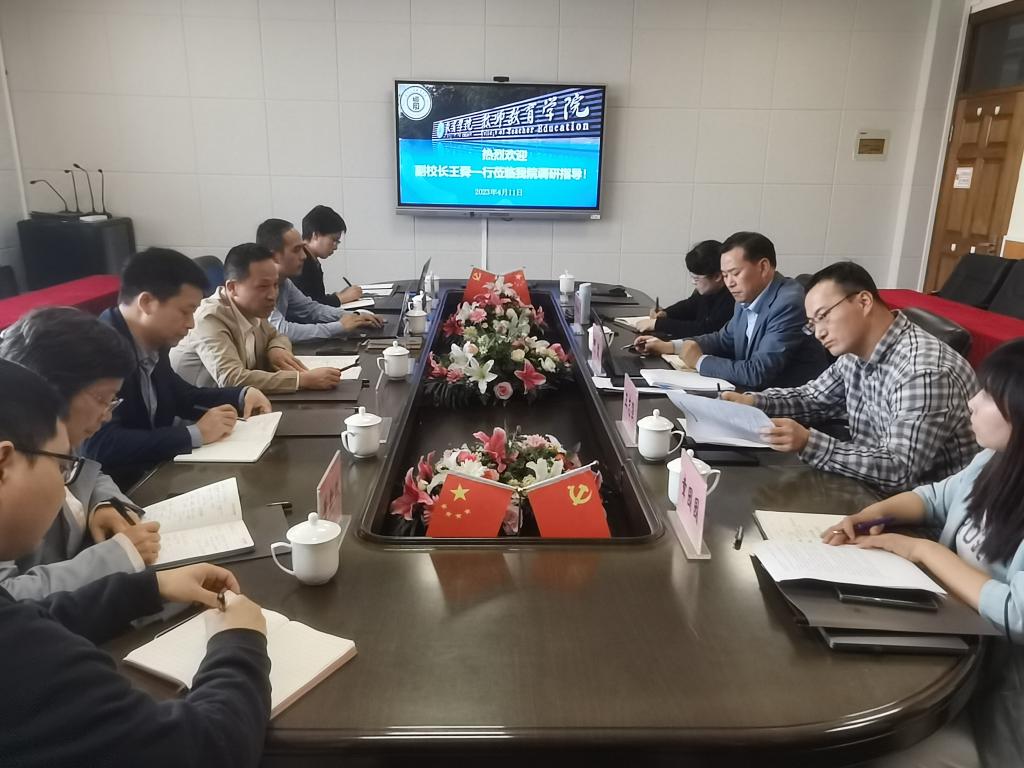 4月11日下午,副校长王舜莅临90直播 调研指导,教务处罗建利处长、地方合作处熊琳处长、人事处郑彩莲处长、教发中心董新姣主任等陪同调研,学院领导班子出席调研会。