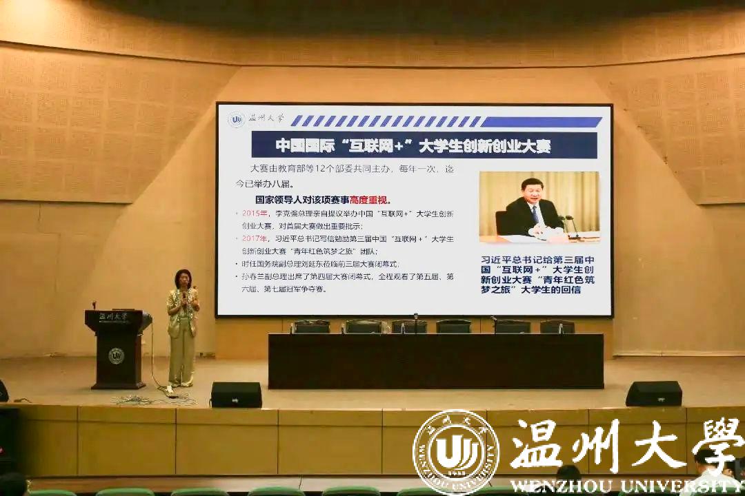 彭小媚进一步介绍了互联网+大学生创新创业项目的情况,温州大学将承办2023年作为浙江省大学生互联网+创新创业大赛,作为东道主要抓紧机会孵化培育项目。她从项目的介绍、项目流程、夺金项目的特征和如何备赛等环节对互联网+大学生创新创业大赛做了全面的分析。她指出,良好成绩的取得得益于学院的高度重视、教师高度投入以及师生联动。