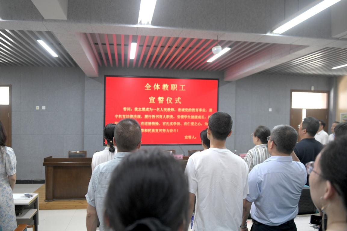 随后,学院举行新教师入职仪式。何书记为毛鹏程等11位新入职教师颁发入职纪念证书、教师师德承诺书、师德师风建设制度摘要等,并合影留念。各系、科室负责人为新教师佩戴校徽,送上鲜花,表达对新入职老师的热烈欢迎和殷切期望。入职仪式后,全体教师起立,进行教师宣誓仪式,重温教师誓词。