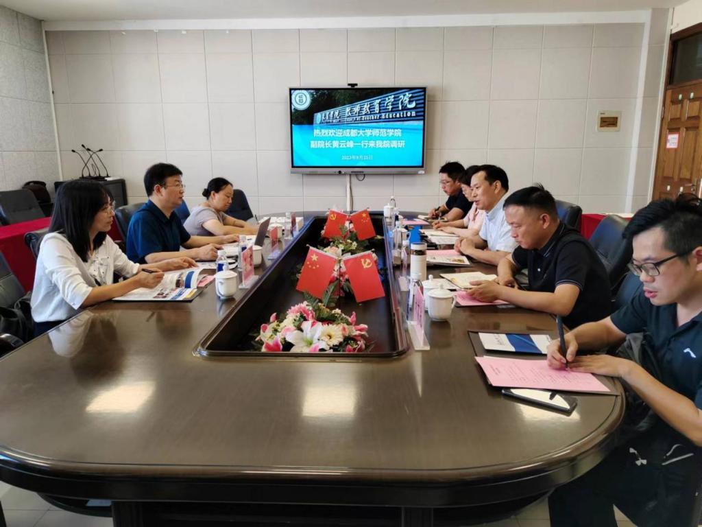 2023年9月25日上午,成都大学师范学院黄云峰副院长一行三人来90足球直播网 调研交流。学院党委书记何毅、副院长叶新东及相关老师参加座谈交流会。