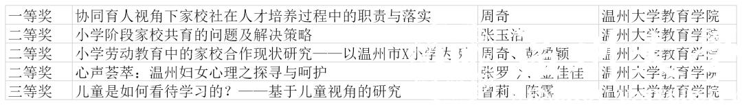 周奇老师的《协同育人视角下家校社在人才培养过程中的职责和落实》获评一等奖,张玉洁的《小学阶段家校共育的问题及解决策略》、周奇老师和彭盈颖共同完成的《小学劳动教育中的家校合作现状研究——以温州市X小学为例》、张罗今和金佳佳共同完成的《心声荟萃:温州妇女心理之探寻与呵护》获评二等奖,曾莉老师和陈露共同完成的《儿童是如何看待学习的?——基于儿童视角的研究》获评三等奖。