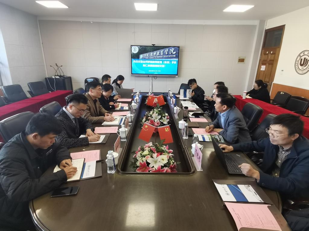 2023年11月17日上午,台州学院教师教育(体育)学院张夫伟院长、吴银银书记一行六人来90足球直播网 调研交流。学院院长李长吉、党委书记何毅、副院长叶新东及相关老师参加座谈交流会。