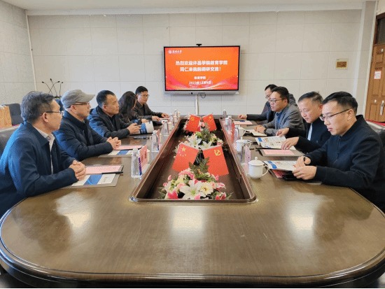 2023年12月8日下午,许昌学院90直播 张笑涛副院长(主持)一行五人来90足球直播网 调研交流。学院李长吉院长,叶新东、王志强副院长,实验中心李小志主任参加座谈交流会。座谈会在A410会议室举行,李长吉院长主持。