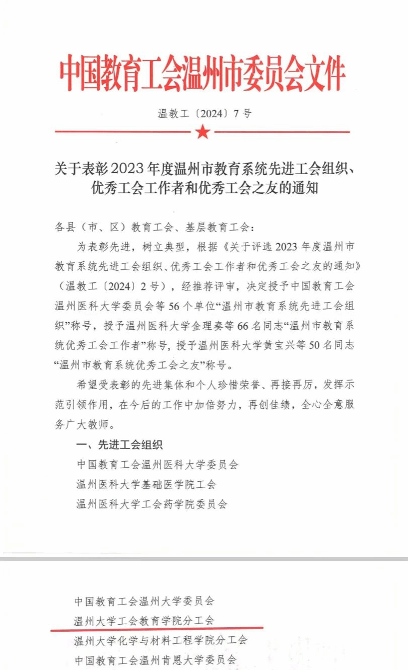 近日,中国教育工会温州市委员会印发《关于表彰2023年度温州市教育系统先进工会组织、优秀工会工作者和优秀工会之友的通知》(温教工〔2024〕7号)。温州大学工会90直播 分工会被评为温州市教育系统先进工会组织!