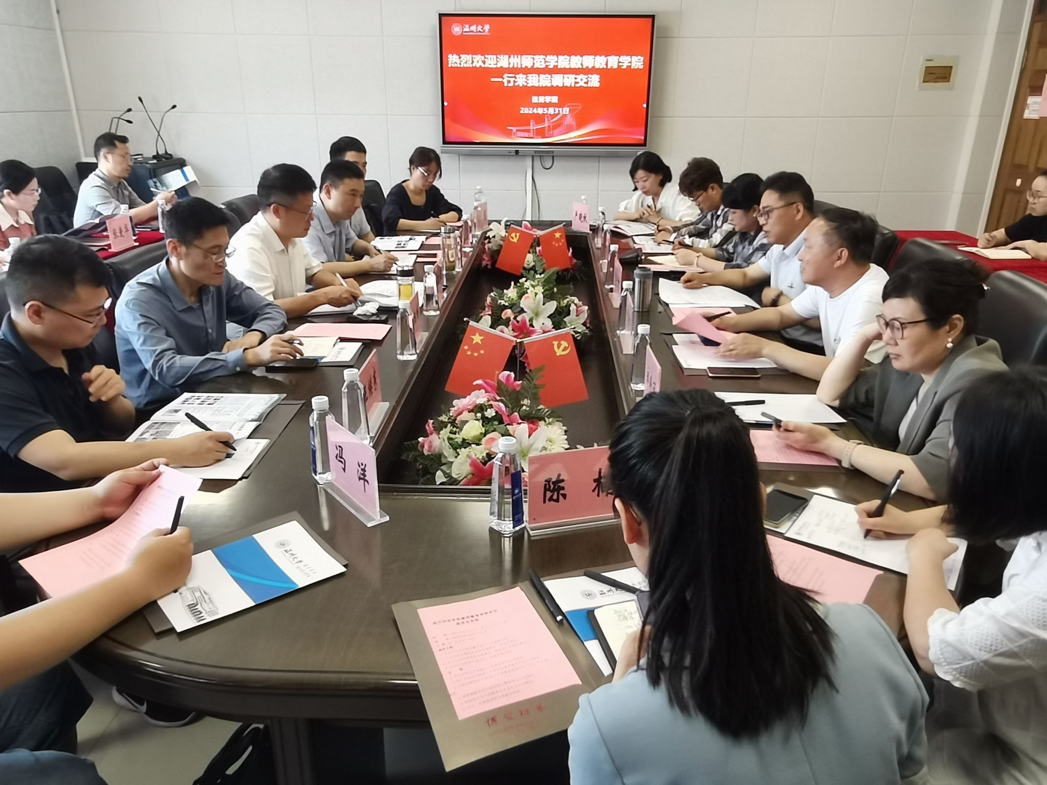 5月31日上午,湖州师范学院教师90直播 党委书记沈江龙、副院长李茂森等一行来90足球直播网 调研交流。学院院长李长吉,副院长叶新东、林琛琛,相关系所(科室)负责人参加座谈交流。