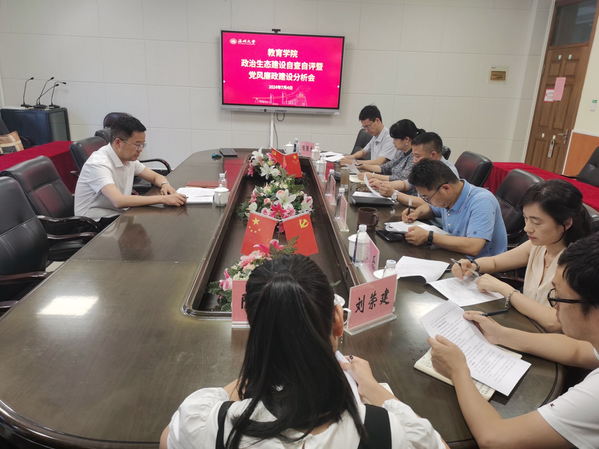 会上,张敏代表教育学院领导班子对学院2024年上半年政治生态建设、党风廉政建设、意识形态工作等情况进行汇报。他从师德师风建设、作风建设、人才引育、经费使用管理、非学历教育工作、学生宗教信仰、少数民族学生管理等方面分析了学院在党风廉政、意识形态方面可能存在的风险和漏洞,并深刻剖析了风险点存在的原因,围绕这些风险点提出了针对性的改进措施。班子其他成员就各自分管领域的党风廉政建设、意识形态工作做补充说明。