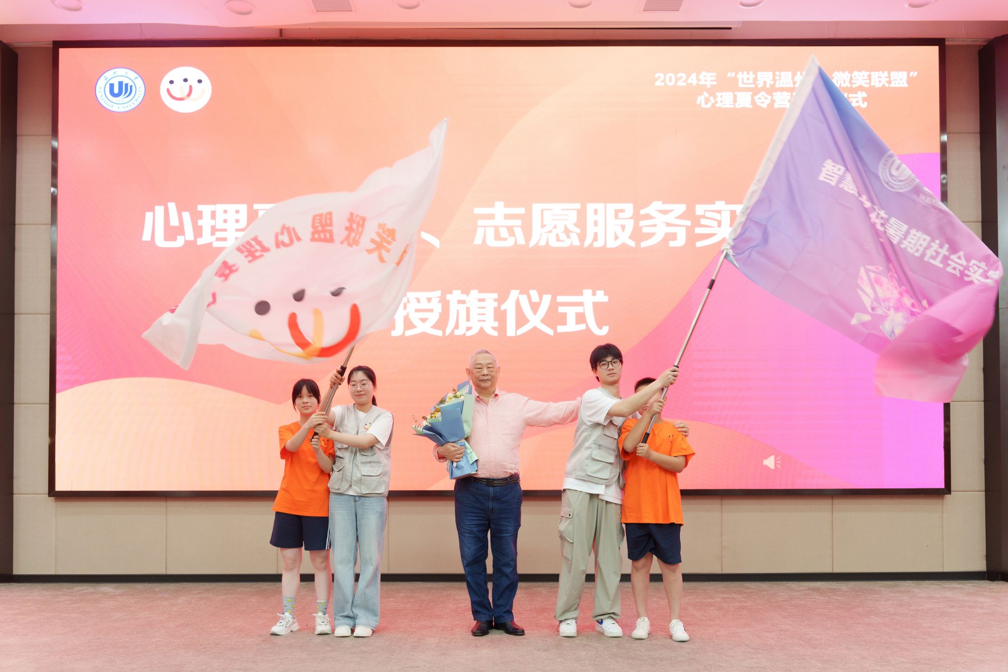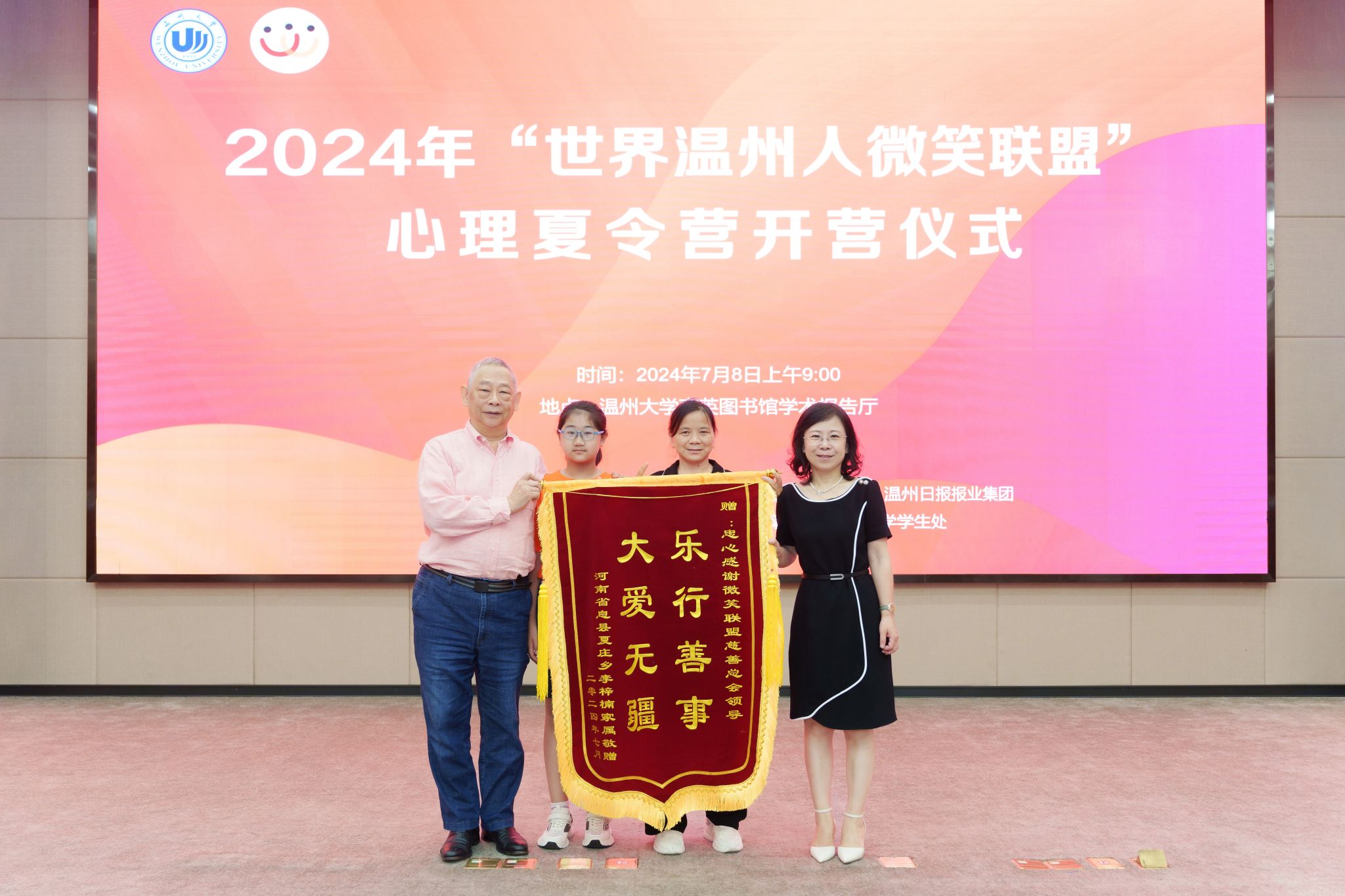 何纪豪先生与在座嘉宾和营员们分享了“世界温州人微笑联盟”项目成立的历史渊源和背后的暖心故事,肯定了微笑儿童们在心理夏令营的帮扶下发生的积极改变,倡导广大温州人能够抱团行善、传递大爱精神。何纪豪先生还为心理夏令营和志愿服务实践队授旗,并邀请温州医科大学附属口腔医院党委书记潘乙怀共同接受受助儿童代表赠送的锦旗。