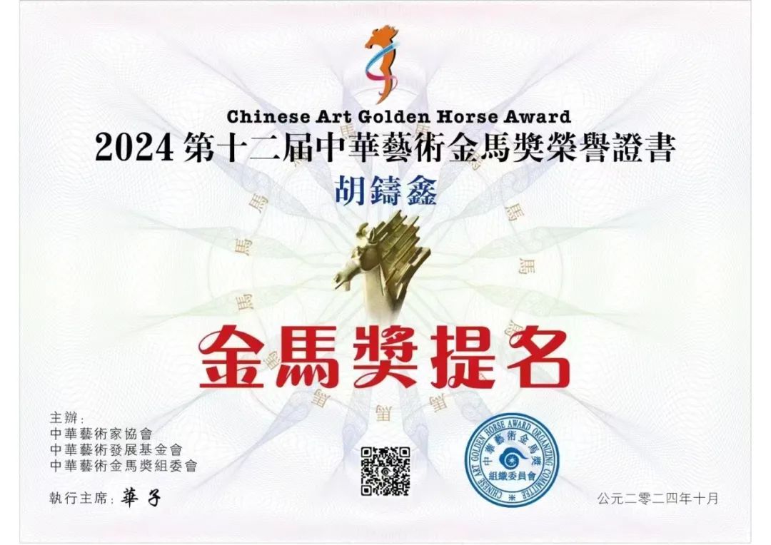 中华艺术金马奖,作为华人艺术界的最高荣誉之一,一直以来都秉持着推动华人艺术创作、展现多元文化风貌的宗旨。隶属于视觉(中国)有限公司,诞生于2006年1月。它的创办初衷是为了褒奖全球华人在中华艺术创作领域获得卓越成就的艺术家。获奖者首先要在本年度国内外权威艺术活动和赛事中获得过最高奖,才具备中华艺术金马奖的申报资格。经过中华艺术金马奖专业评审委员会的严格评审,胡老师的作品凭借其本年度里在国内外重大赛事的获奖量及综合分,在众多参赛作品中脱颖而出,成功斩获殊荣。