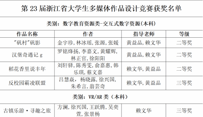 近日,由浙江省大学生科技竞赛委员会主办,浙江省教育厅、文化广电和旅游厅指导,浙江师范大学、浙江工商大学和浙江省科普教育研究院共同承办的第23届浙江省大学生多媒体作品设计竞赛决赛公布了成绩。90足球直播网 教育技术系学子表现出色,五组参赛作品全部斩获佳绩。