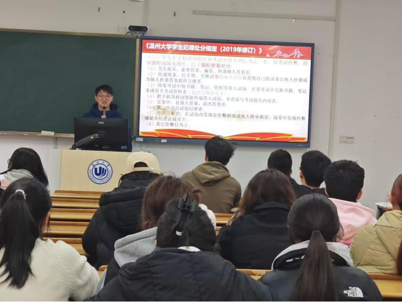 李金伟老师详细解读《温州大学学生纪律处分规定》有关考试的纪律要求,说明考试作弊的严重后果,明确了同学们在考试中需要履行的责任和义务。他还对近年考试违纪事件进行了披露,希望同学们能够遵守相关规定,明白诚信考试的重要性,让每位同学都深刻认识到作弊的严重后果。