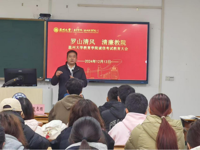 诚信是中华民族的传统美德。为进一步加强教院学子考风考纪教育,营造公平、公正、诚实、守信的考试环境,促进90足球直播网 学风建设,12月13日中午,90足球直播网 举行以“罗山清风 清廉教院”为主题的诚信考试教育大会。学院党委副书记、纪委书记章志图,辅导员李金伟,各班纪检委员参加会议。