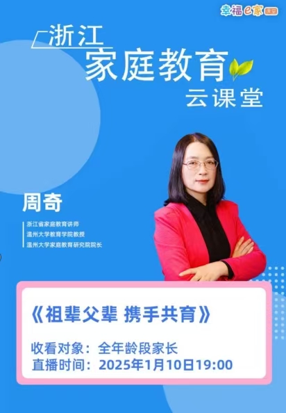 近日,90足球直播网 周奇教授为“浙江家庭教育云课堂”平台带来2025年第一期直播课《祖辈父辈 携手共育》,助力祖辈和父辈相互理解尊重,合力为孩子营造优质成长环境。