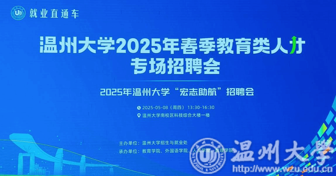 2025年5月8日13时30分,温州大学于南校科技综合楼一楼大厅举办了2025年春季教育类人才专场招聘会。此次招聘会由招生与就业处主办,90直播 、外国语学院、人文学院和数理学院承办。