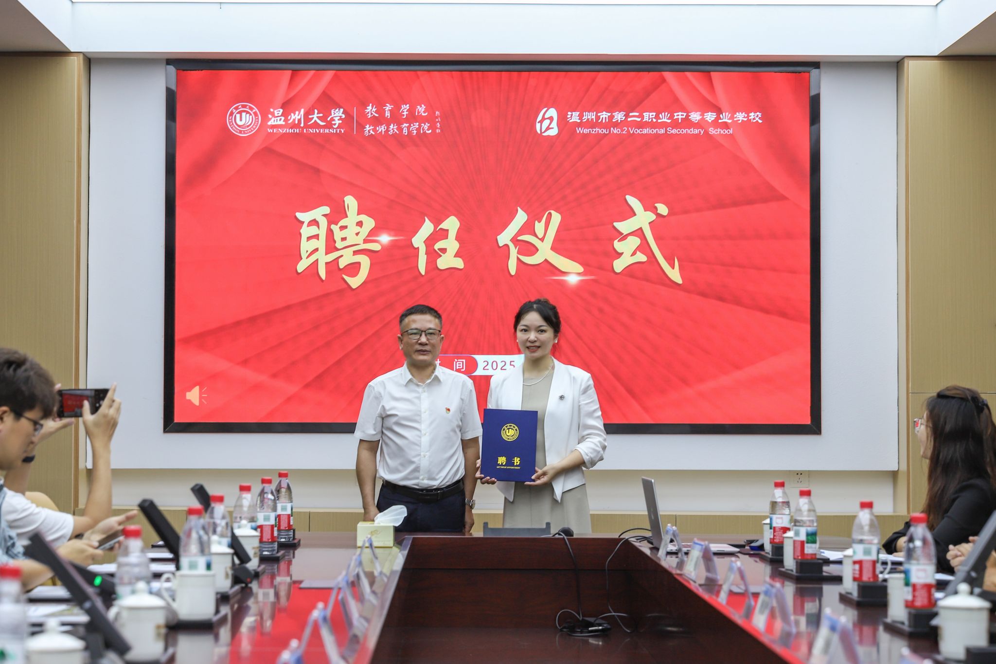 会议还举行教育专硕校外实践指导教师聘任仪式,张敏向温州二职校长潘乐慧博士颁发“温州大学教育硕士专业(心理健康教育)校外实践导师”聘书。
