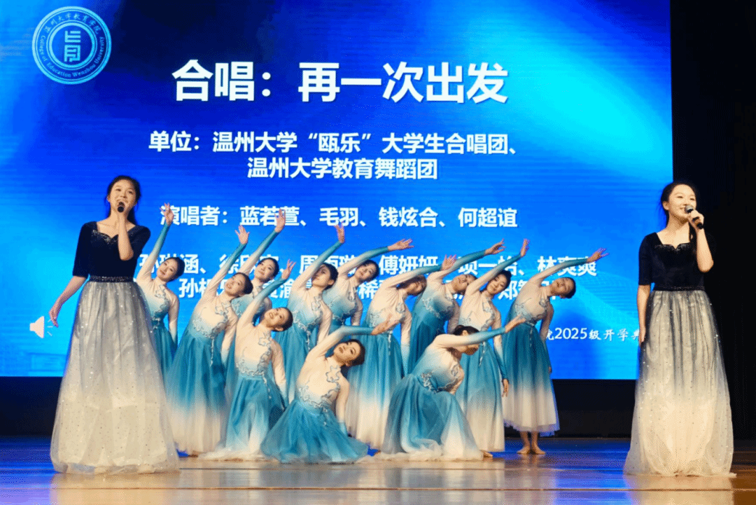 温州大学“瓯乐”大学生合唱团及教育舞蹈团等9名同学带来了小组表演唱《再一次出发》。随后,温州大学“瓯乐”大学生合唱团领唱,全体师生共同齐唱了温大校歌。