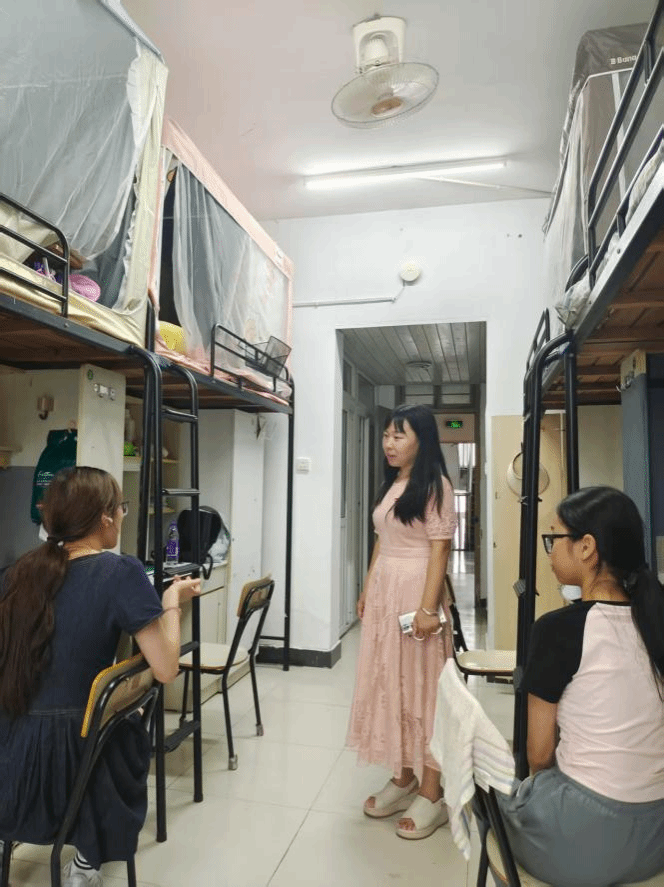 林琛琛副院长在走访D区寝室时组织新生相互介绍,围绕校园环境适应、专业期待、学习目标设定以及社团兴趣、室友关系等话题展开交流,鼓励大家主动适应大学学习与生活,遇到困难及时向学院反馈。