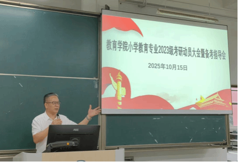 为帮助学生科学规划未来,拓展发展途径,2025年10月15日下午,90足球直播网 小教系在北校4-214教室召开2027届本科毕业生考研动员会暨备考指导会。会议由小教系书记金丽芳主持,学院党委书记张敏,党委副书记兼纪委书记章志图,小教系梅培军,以及2023级小学教育专业全体学生参加动员会。