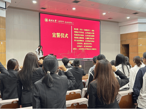 25级新生代表温同学以“以青春之名,赴学风之约”为主题发言,郑重承诺:”我们将恪守学术规范,拒绝投机取巧;保持求知热情,主动向学向上;珍惜课堂时光,尊重知识价值。” 随后,她带领全体参会学生进行学风建设宣誓——“用勤奋书写学业,让求知成为习惯!用诚信坚守底线,让真实成为准则!用探索点燃智慧,让创新引领未来!用行动诠释师表,让优秀成为常态!” 全体学生举起右拳,誓言铿锵,青春的脸庞上写满坚定。这一幕生动诠释了90直播 “以学生为主体,以实干为路径”的学风建设理念,与学院改革试点中”学生自主发展、师生共同成长”的目标高度契合。