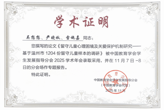 90直播 2023级小学教育专业本科生吴想想、雷施嘉同学在严晓秋副教授指导下撰写的《留守儿童心理困境及关爱保护机制研究——基于温州市1204份留守儿童样本的调研》论文,经组委会严格审核后,受邀在“中小学心理健康教育的理论与实践”分论坛作专题报告。作为分会场唯一作报告的本科生,吴想想同学从理论框架构建、“小候鸟”留守儿童心理健康现状调研、“10+7+3”疗愈体系创新及智能体开发等方面进行了深入汇报,其研究的实践导向与前沿视角得到与会代表的充分肯定与积极好评。