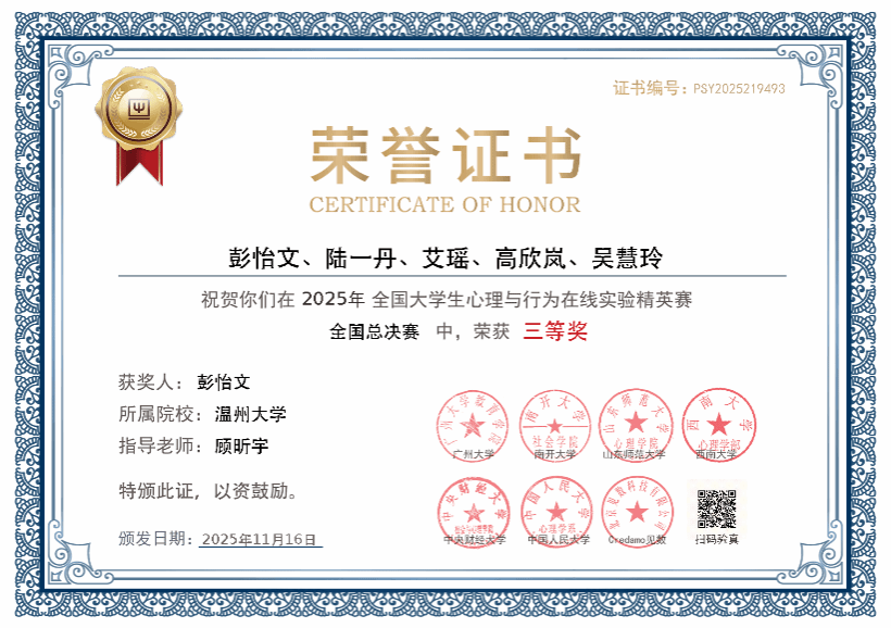 第三届全国大学生心理与行为在线实验精英赛,既是一场汇聚全国高校心理学创新成果的国家级高水平赛事,更是一次检验高校人才培养质量与学科建设水平的权威亮相。90足球直播网 学子在此次赛事中取得优异成绩,既展现当代大学生勤学善思、锐意进取的风貌;更彰显温州大学教师90直播 心理系育人硬实力。此荣誉既是师生同心的结晶,更是学院深耕心理学学科、坚守育人初心的有力印证。