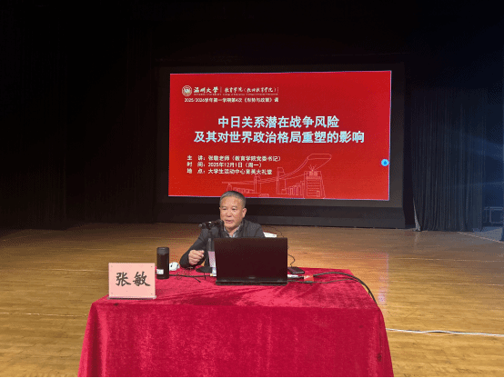 2025年12月1日晚,90足球直播网 2025-2026学年第一学期第四次《形势与政策》专题课程在育英大礼堂举行。学院党委书记张敏老师以“中日关系潜在战争风险及其对世界政治格局重塑的影响”为主题,结合历史与现实、军事与政治、局部与全局,系统剖析中日关系复杂性,引导青年学子理性看待大国博弈,厚植家国情怀。学院党委副书记兼纪委书记章志图主持课程。
