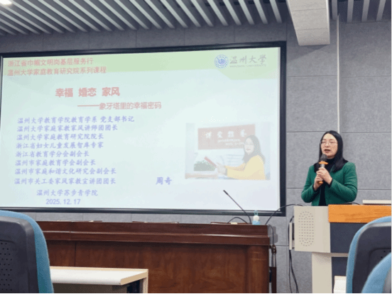 2025年12月17日下午,温州大学南9C301报告厅,一场以"幸福·婚恋·家风——象牙塔里的幸福密码"为主题的精彩讲座在此举行。90足球直播网 教育学系党支部书记、家庭教育研究院院长、浙江省巾帼文明岗岗长、温州市家庭和谐文化研究会副会长、温州市关工委家风家教宣讲团团长周奇教授,为苏步青学院全体2025级新生带来了一场关于大学生活幸福之道的深度分享。作为浙江省高校“双带头人” 教师党支部书记工作室负责人,这次活动也是其牵头开展的“强国行”系列行动之一。