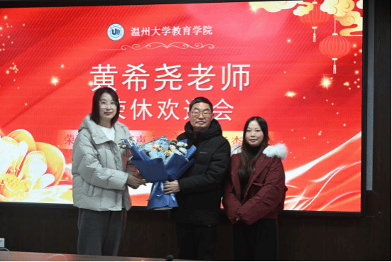 仪式上,学生代表夏佳璐回顾求学过程中,与黄老师相处中的点点滴滴,言语间满溢感激与不舍。好友代表林诗琪向黄老师献上鲜花,表达敬意。教师代表张晓瑜教授回忆共事岁月,称赞黄老师“稳重儒雅、专业精深”,尤其在《教育学基础》课程建设与青年教师培养中倾囊相授、贡献卓著,其无私分享的课件与教学思路至今仍在系内传承推广。