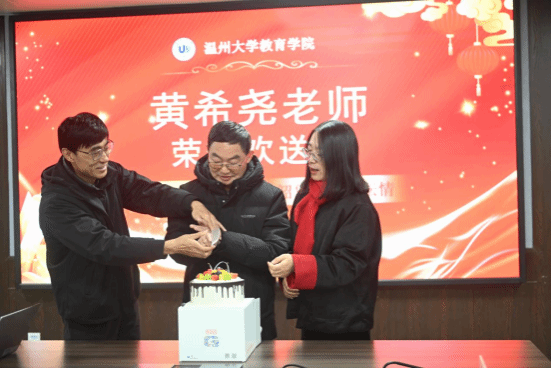 在“来宾送祝福”环节,学院工会主席胡雯、校友周文肖、好友林飞、邓纯考、王国辉、万荣根等逐一送上温暖的寄语,现场温情流淌。随后,教育学系主任折延东教授、教育学系书记周奇教授陪同黄老师共切荣休蛋糕,寓意圆满与甜蜜,象征着教育事业的甘美传承。