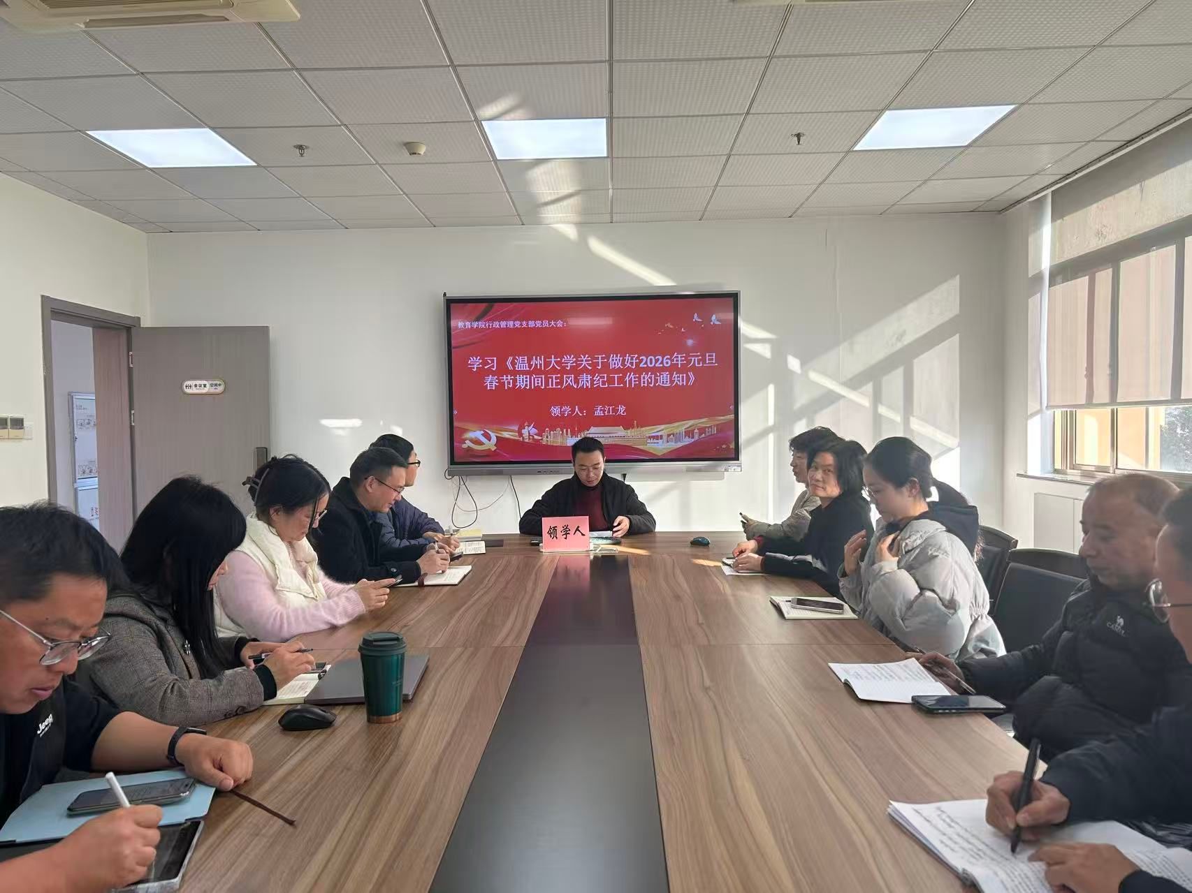 孟江龙同志传达了《温州大学关于做好2026年元旦春节期间正风肃纪工作的通知》,明确了“九个严禁”的纪律要求,筑牢了廉洁防线。他强调,党员干部要在节日期间严格遵守纪律,坚决杜绝各种形式的违规违纪行为,保持清正廉洁的政治本色。