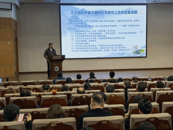 会议专题部署学院党风廉政建设工作。张敏传达上级相关文件精神,重申了教职工因私出国(境)管理要求。章志图就2026年春节期间正风肃纪工作进行提醒,明确“九个严禁”的纪律要求,强调全体教职工要严格遵守纪律,坚决杜绝各种形式的违规违纪行为,保持清正廉洁的政治本色。