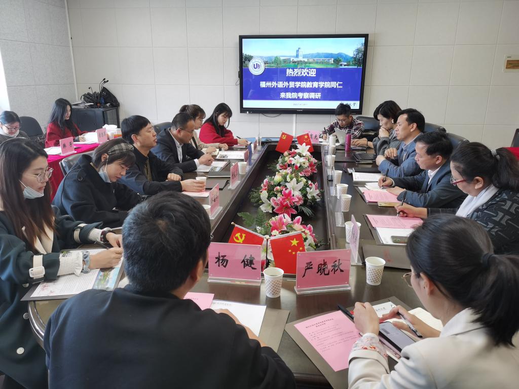 2021年4月19日上午,福州外语外贸学院90直播 院长刘炎欣、党委书记林业铖一行10人来90足球直播网 调研交流。学院党委书记何毅、副院长叶新东、副书记彭小媚出席接待,小教系、学前系、学工办、实验中心相关负责人和老师参加座谈。