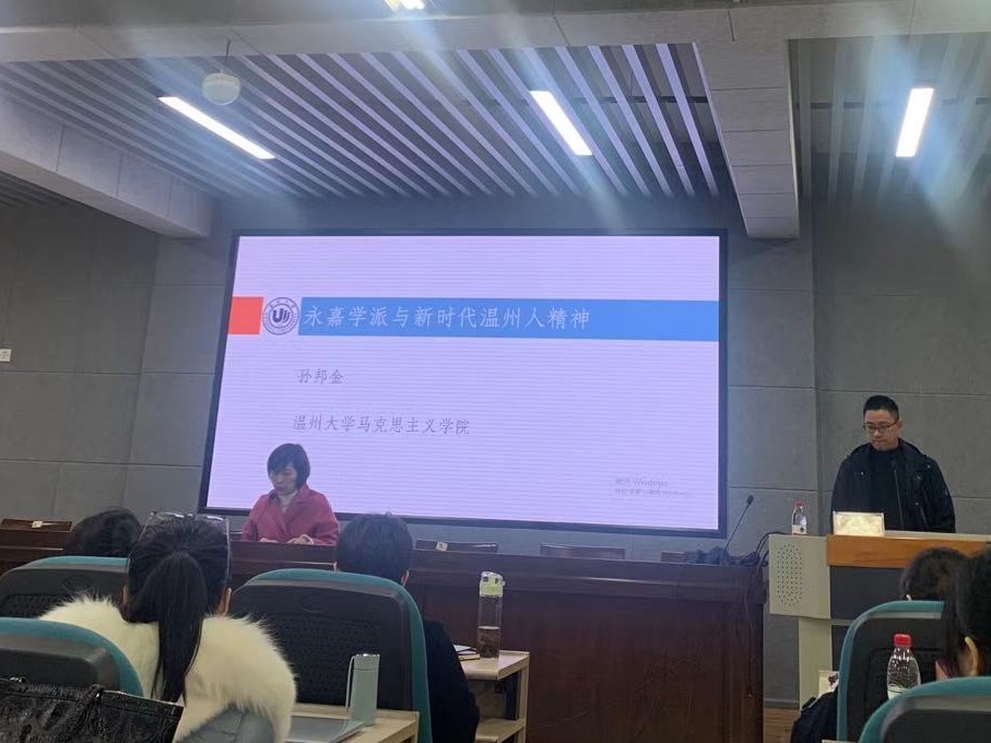 孙邦金教授以《永嘉学派和新时代温州人精神》为主题向全体教职工做精彩讲解。他剖析了永嘉学派的产生以及永嘉学派中的温州人精神内核。他指出,源于南宋的永嘉学派不仅奠定了新时代温州人精神的文化基因,更是温州人精神的哲学升华,永嘉学派第一次从哲学的层面总结、提炼、升华了温州人精神的内涵,这是温州人走向文化自觉的标志性事件。”同时,他从“道在器中,事上理会”,“因地制宜,工商皆本”,“以利和义,义利并举”,“民自为生,藏富于民”四个方面从哲学层面对温州人精神内核进行阐述。最后,他分享了对当代温州人面对未来应该如何继续勇立潮头的思考,希望新时代温州人从开放、创新、重教三个方面去继承与发扬温州人精神。