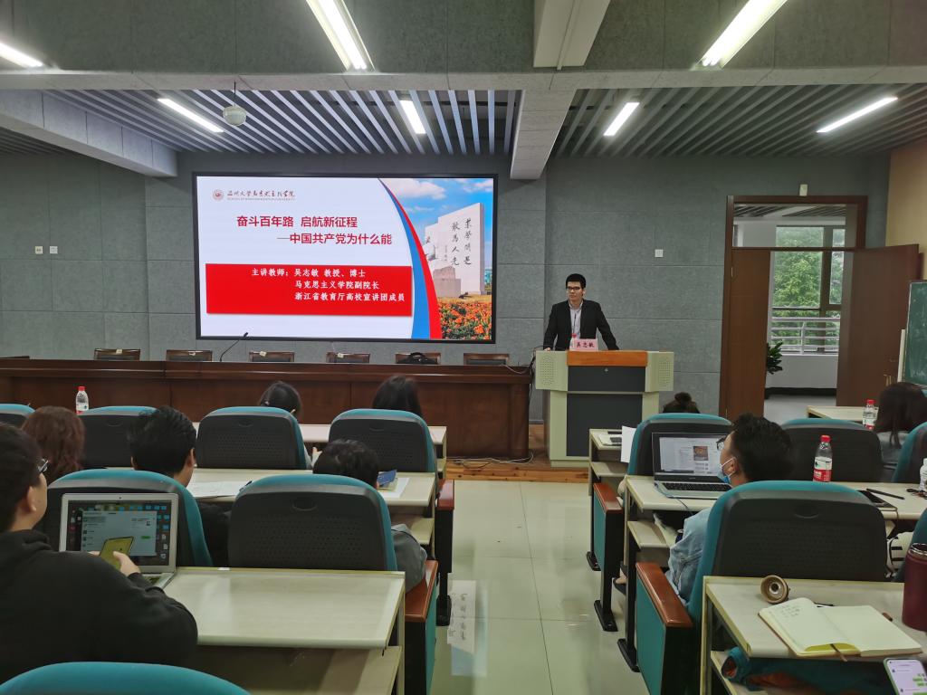 学院教职工大会结束后,学院召开全院教职工理论学习会。会议由何毅书记主持,温州大学马克思主义学院副院长、吴志敏教授主讲。吴志敏以《奋斗百年路 启航新征程—中国共产党为什么能》为主题向全体教职工做精彩讲解。他围绕习近平总书记实现中华民族伟大复兴的讲话精神,从时代性、人民性、革命性、斗争性等四方面,对中国共产党党史进行了系统、全面的精彩解读。他指出,实现中华民族伟大复兴,是近代中国面临的最大时代课题,更是改变世界新格局的必由之路。”最后,他从“四个考验”、“四大危险”、“四个伟大”三个方面阐述全面从严治党。与会人员通过党史学习,纷纷表示要传承中国共产党在长期奋斗中铸就的精神,推动党史学习教育融入于日常点滴中,更好地完成为党育人、为国育才的伟大使命。