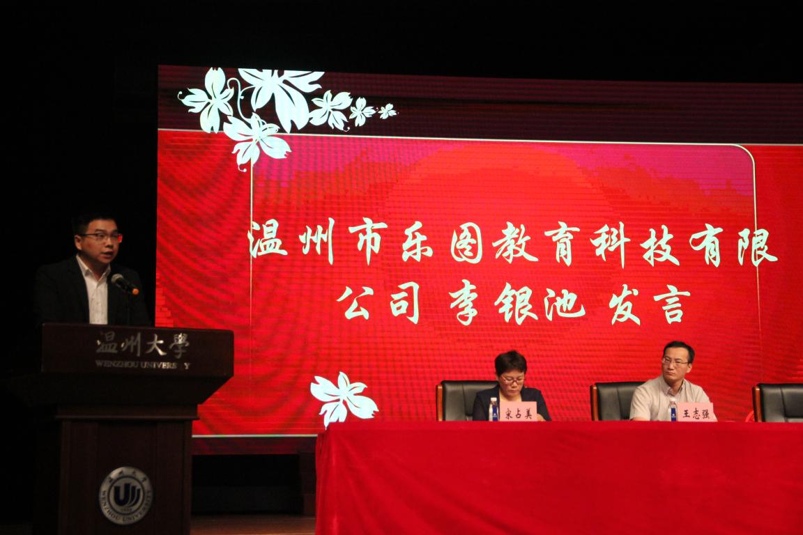 温州市乐图教育科技公司总经理李银池致辞。他简要介绍了柳瑛女士在温州大学的求学经历,以及离开学校后怀揣着教育梦走上创业之旅的过程;表达了温州市乐图教育科技公司一直以来热心教育、服务大众的公益之心,并说明了此次捐资助学的初衷和愿景。