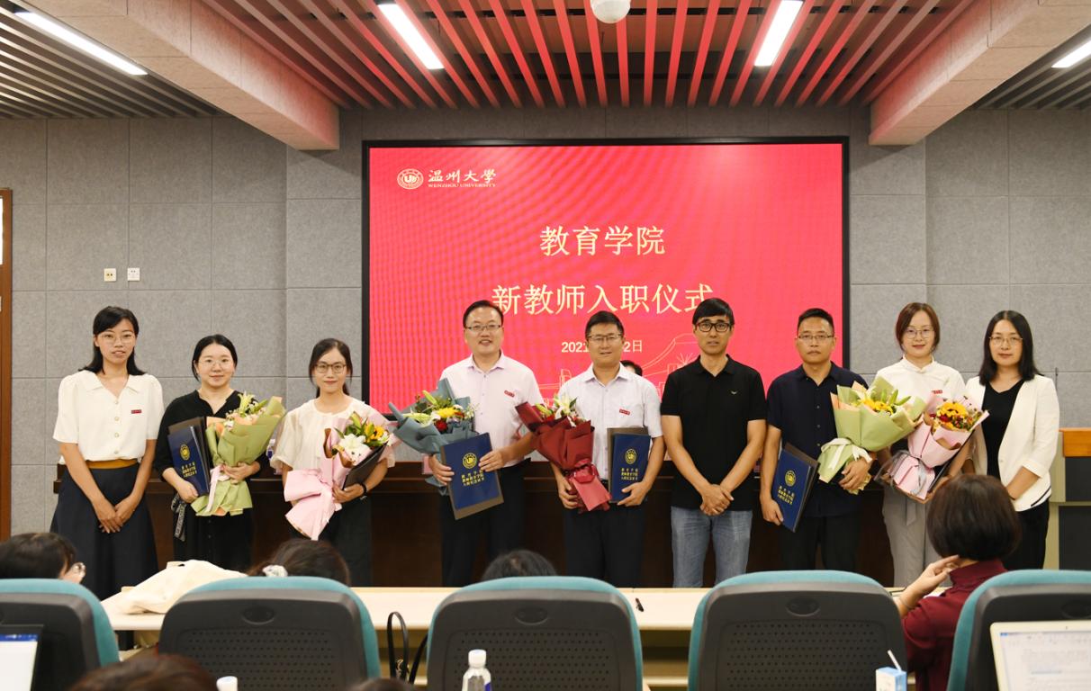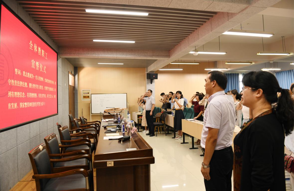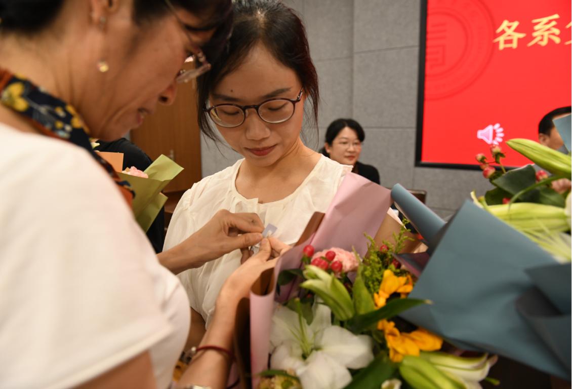 首先进行隆重而热烈的新教师入职仪式。何书记为新入职的6位教师颁发入职纪念证书、师德承诺书以及师德师风建设制度摘要等材料,新教师们怀着激动的心情走上主席台,何书记为新教师一一颁发90直播 入职“三件套”并合影留念。各系负责人为新教师佩戴校徽,并送上鲜花,表达对新入职老师的热烈欢迎和殷切期望。入职仪式后,全体教师起立,举起右手,进行教师宣誓仪式。作为教育工作者,每年在教师节前夕举行全体教师宣誓是学院师德建设的传统,提醒全体教师时刻不忘立德树人初心,牢记为党育人、为国育才的使命。