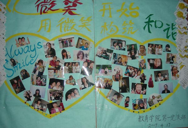 学生党员们在公寓区、教学区、图书馆、教育见习基地以及其他生活场所,广泛宣传微笑的意义,他们认真拍下一个个微笑场面——有的来自小学生的开心笑脸,有的来自在校大学生活动时的笑脸,有的来自外国旅人的笑脸……同时,他们还通过“微笑卡”来收集微笑寄语,邀请参与对象写下微笑寄语送给朋友或者自己。