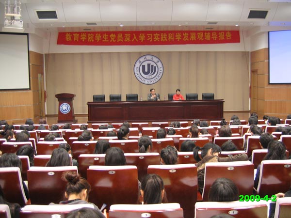 为了深入学习实践科学发展观,90直播 有步骤的开展了一系列活动。4月2日晚18:30,90直播 盛情邀请温州大学学生处潘玉驹处长,在茶山北校区信息楼报告厅,为90直播 学生党员、预备党员、发展对象共200多名同学开展深入学习实践科学发展观辅导报告。辅导报告会由90直播 党委副书记嵇小怡同志主持。据悉,专门邀请学校部门领导为学生党员开展学习实践科学发展观辅导报告,这在校内还是首次。