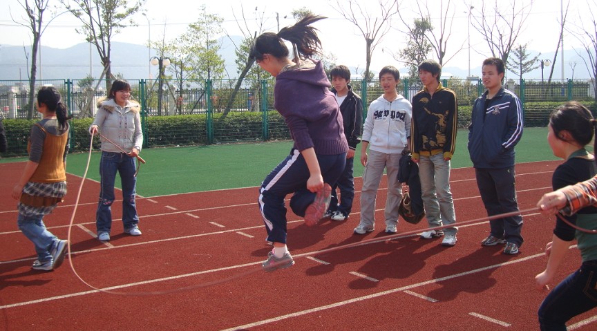 在两人三足环节中,两位同学手牵手肩并肩,虽然两脚被绑到一起,但同学之间仍旧配合默契,速度飞快。当然,偶尔也会出现脚步混乱的场面。比赛激烈,场外观看的同学热情更是高涨,加油声、呐喊声,震耳欲聋。而呼拉圈环节,难度也不小。要在保持转动的同时,快步前进,这绝非易事。赛场上,在女生间不难发现还有男选手。当被问有无信心时,男生说:“别以为这些只有女生行,其实男生也不弱。待会就让你们瞧瞧!”果然,话不是吹的。只见几个男生健步飞奔,实力不容小觑。