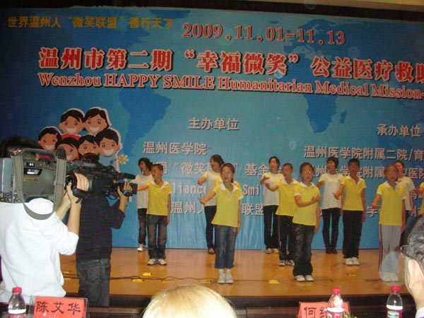 2009年11月2日上午8:30,温州市第二期“幸福微笑” 医疗救助活动启动仪式在温州医学院学术馆隆重举行。 “世界温州人微笑联盟” 是由爱国台胞何纪豪先生发起,在温州开展幸福“微笑活动”行动,2008年5月,何纪豪先生发起并捐助10万美元,邀请美国微笑联盟派遣了39名医护人员来到温州,为温州110个贫困家庭的唇鄂裂儿童免费做了修复手术。据了解,唇腭裂患者的治疗不只是单纯的手术修复,而是一个包括整形、正畸、语音、护理和心理等多方面内容的序列治疗过程。其中唇腭裂儿童修复后的心理护理,是调整唇腭裂儿童心理状态,如何走出原有的阴影,根除存在的某些心理问题,建立自信、快乐、善于与人交往的重要手段。